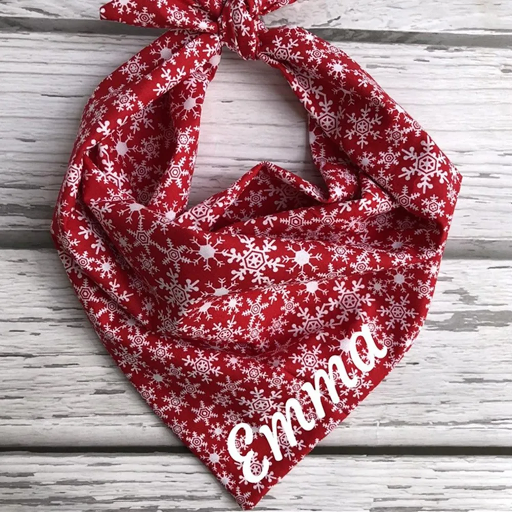 1. Bandana personalizada para perro, bufanda con imagen de cachorro, para Navidad, vacaciones, copos de nieve, nombre rojo